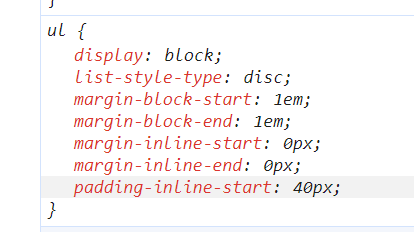 보니까 ul에서 paddinf-inline-start로 40px만큼의 패딩이 들어가 있었다.
