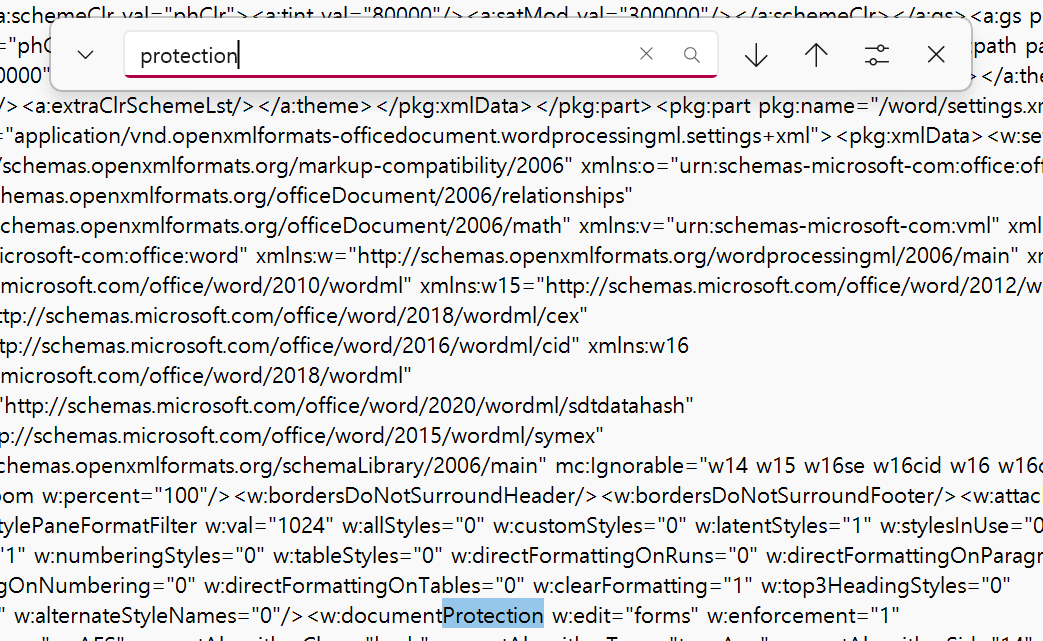 4. <w:documentProtection w:edit=~~~~~~/> 부분을 지운다.