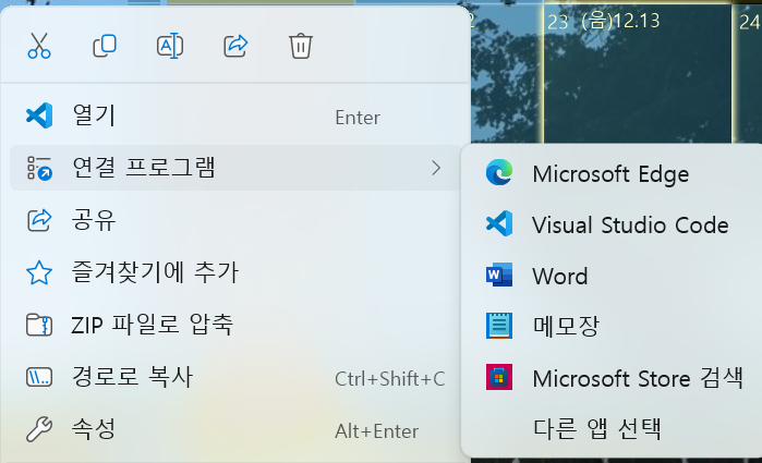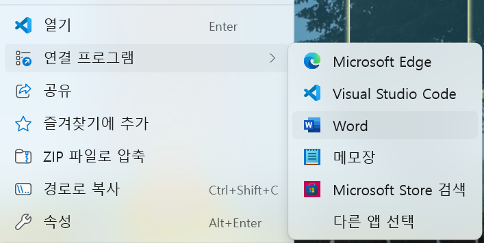 5. 다시 마우스 오른쪽 버튼을 눌러 연결프로그램 -> Word로 들어가서