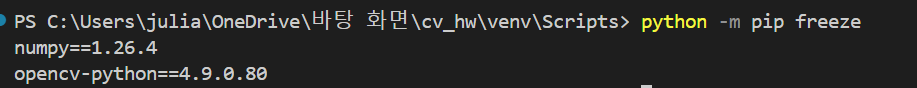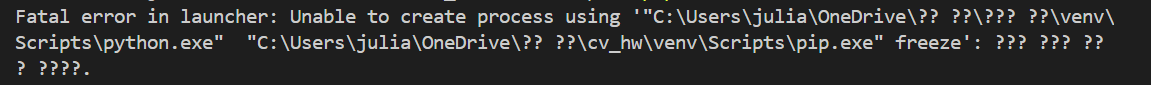 Fatal error in launcher: Unable to create process using '"C:\Users\julia\OneDrive\?? ??\??? ??\venv\Scripts\python.exe" "C:\Users\julia\OneDrive\?? ??cv_hw\venv\Scripts\pip.exe" freeze': ??? ??? ?? ? ????.