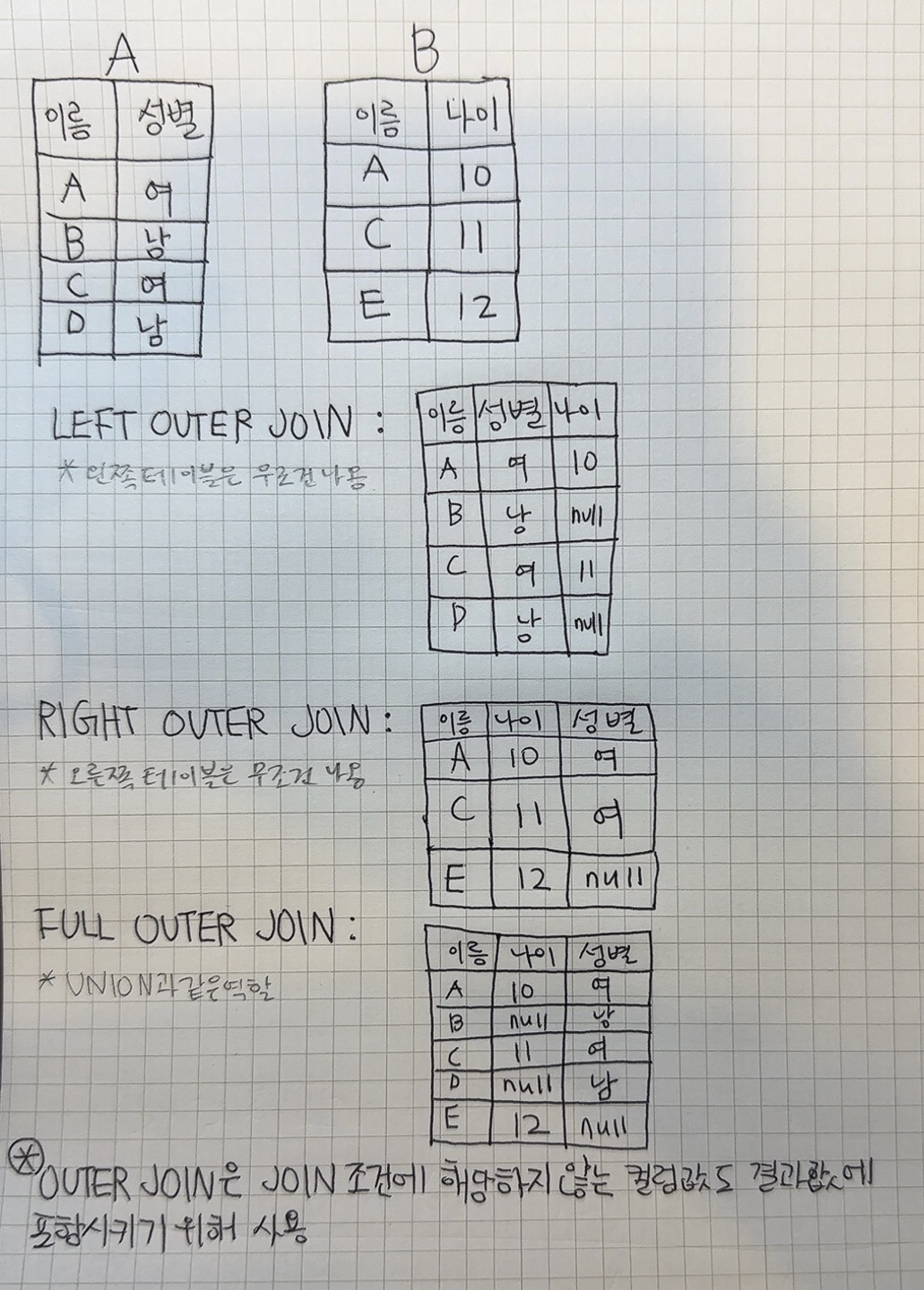• LEFT OUTER JOIN : 왼쪽 테이블의 데이터를 읽은 후 오른쪽 테이블에서 JOIN 대상 정보를 읽어온다. 없는 값은 NULL 값으로 채운다.
